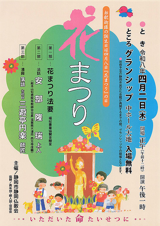 静岡市静岡仏教会(会長:静岡市葵区宮ヶ崎町 報土寺住職 戸﨑博隆)では静岡県コンベンションアーツセンター グランシップ中ホール大地にて、釈尊降誕会「花まつり」を令和8年4月2日(木)13時より開催致します。